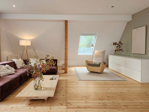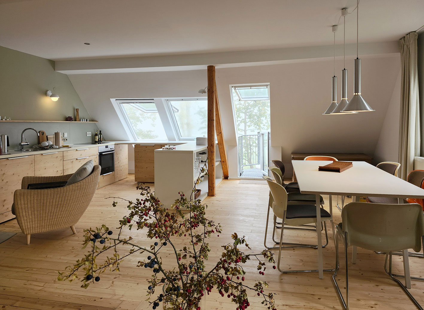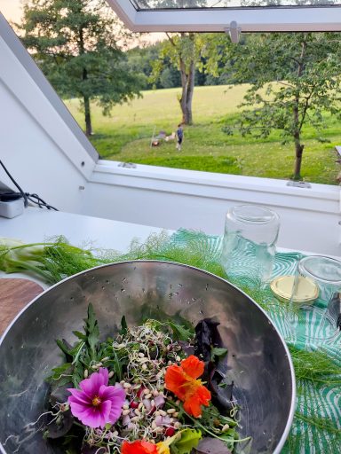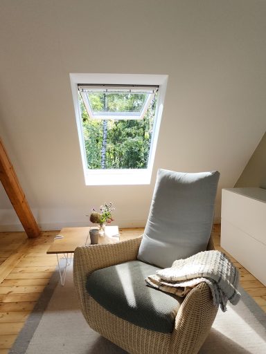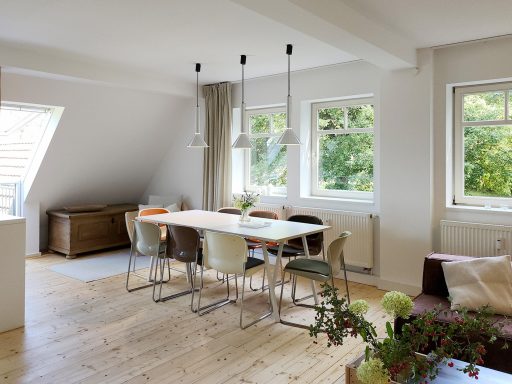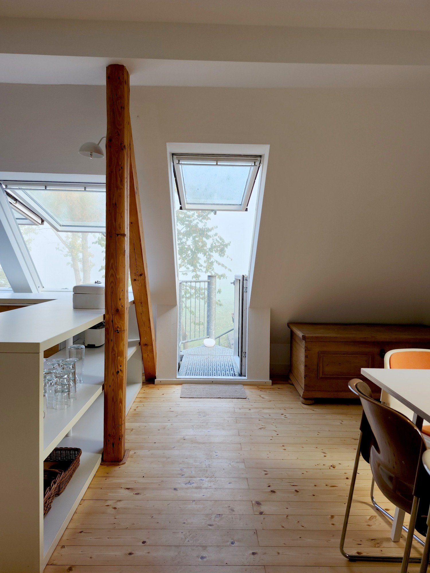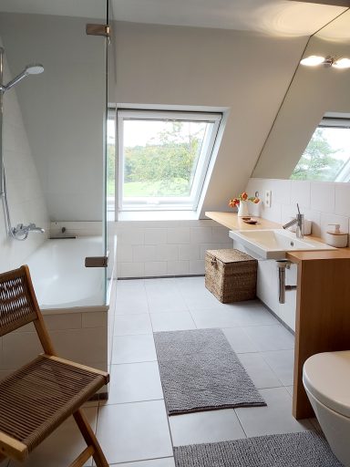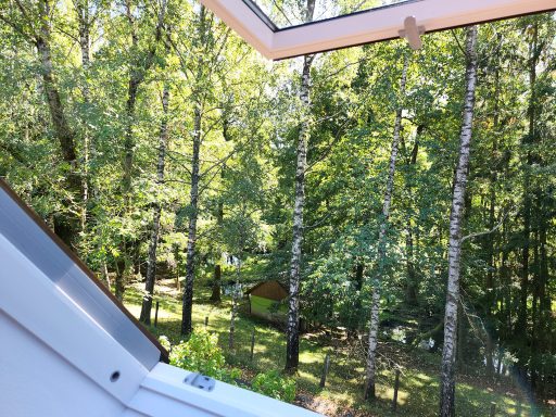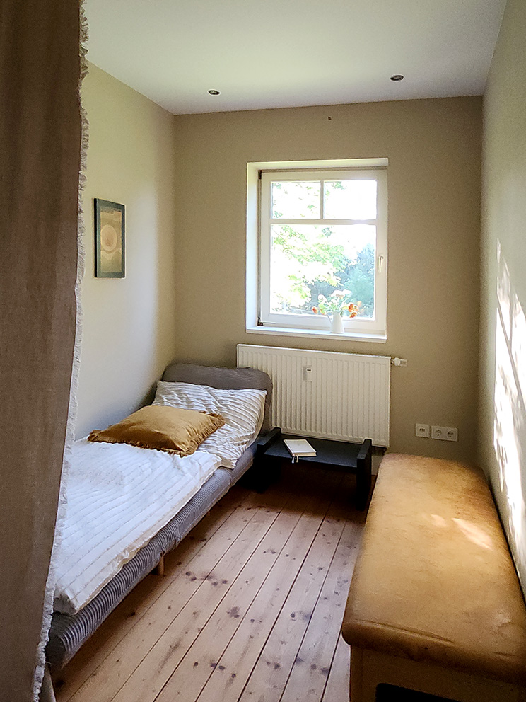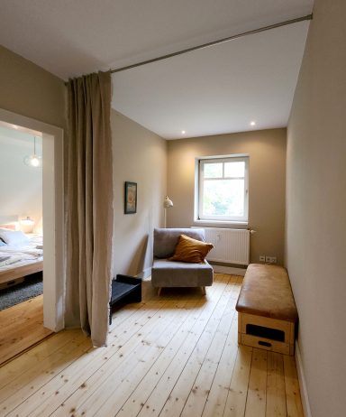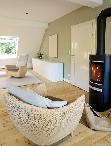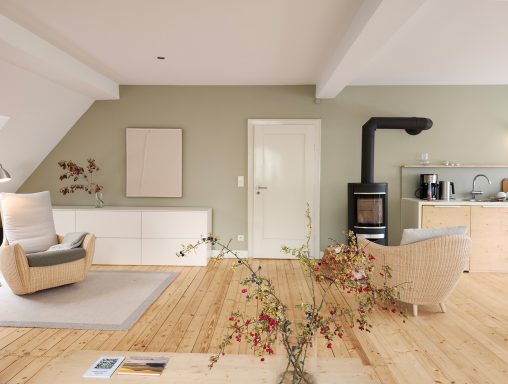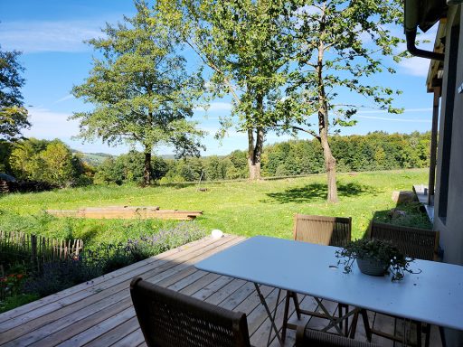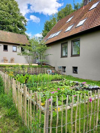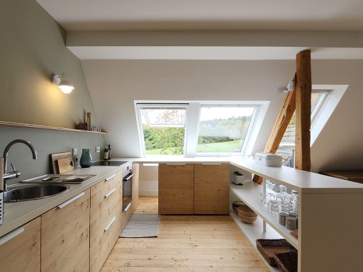 Durch die vielen Fenster öffnet sich der Blick in die Natur und schafft lichtdurchflutete Innenräume. Die ehemalige Lehrer-Wohnung wurde in eine Wohnung mit 3 Schlafräumen und 2 Bädern umgestaltet mit großzügigem Wohnraum, offener Küche und Essbereich. Er bietet den Wohlfühl-Raum für einen Urlaub mit den Liebsten. Über eine Wendeltreppe gelangt man zur privaten Holz-Terrasse, die übergeht in den Naturgarten und die unberührte Natur. Ein Ort um zur Ruhe zu kommen und die Seele baumeln zu lassen.